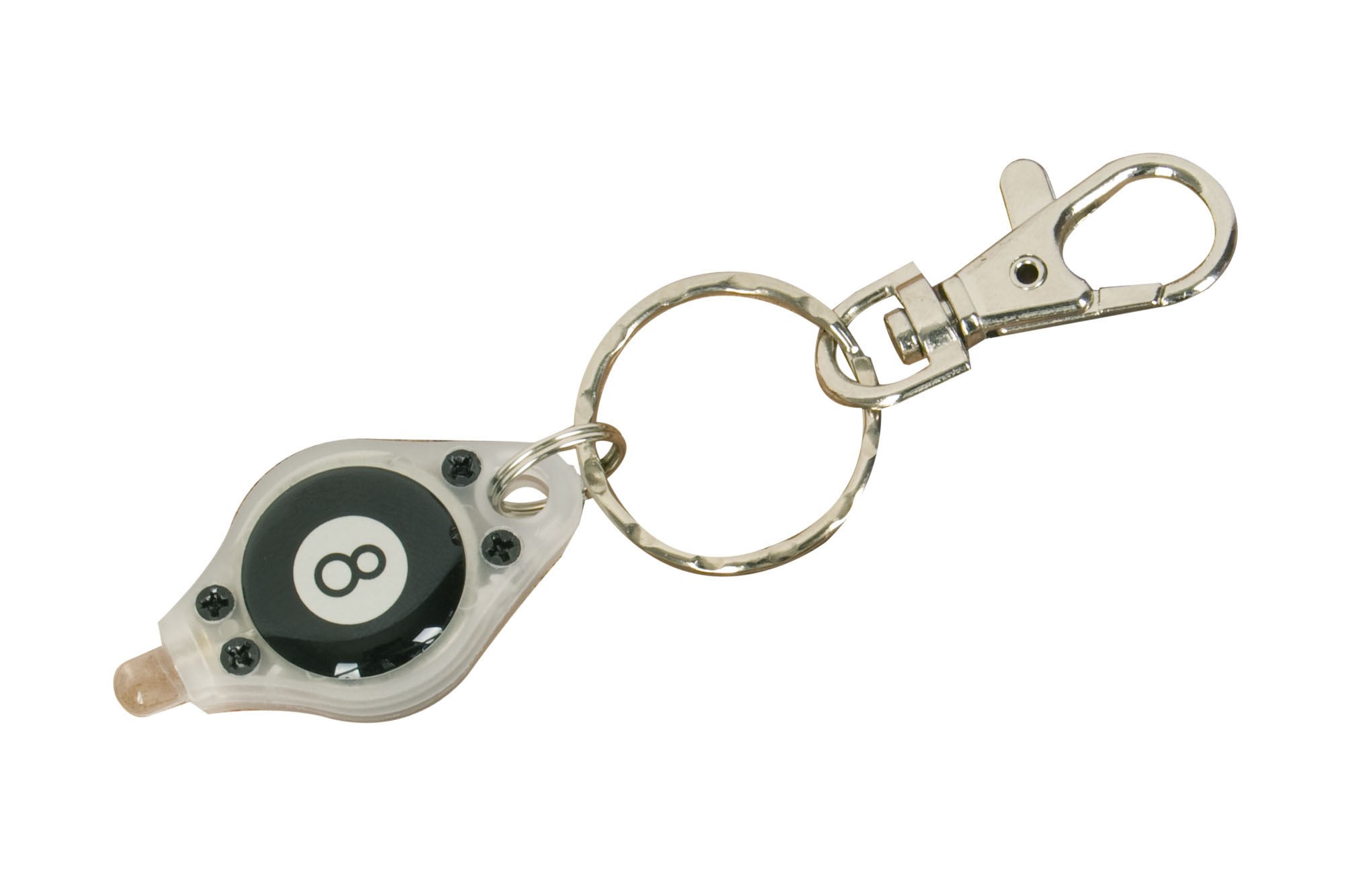 Schlüsselanhänger im Design der Billardkugel Nr. 8 mit heller LED-Leuchte. Ideal geeignet als kleine Aufmerksamkeit für Billard-Fans.